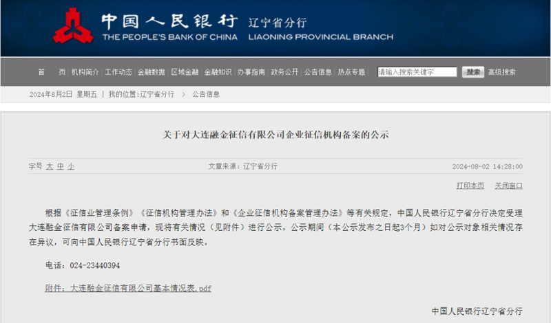 大连地方征信平台获征信备案公示